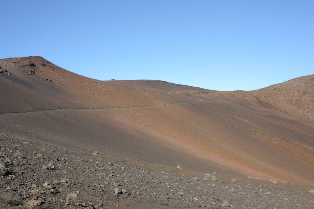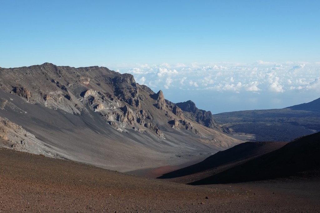 The “sliding sands” refers to the colourful streaks of sand swooping down the crater’s inner edge. Being inside the crater feels like being on an entirely different planet. One with its own signs of life, like the endemic (meaning, only found in a single place on Earth) ‘āhinahina or Haleakalā Silversword, pictured below.